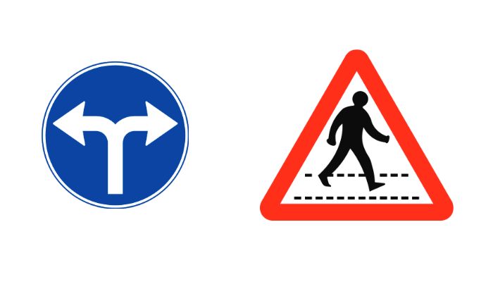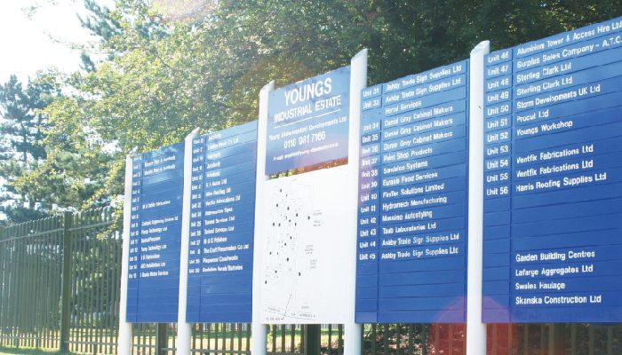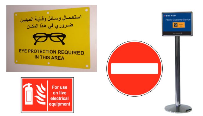 Fire exit signs, warning stickers, direction boards, and safety signage in multiple materials.