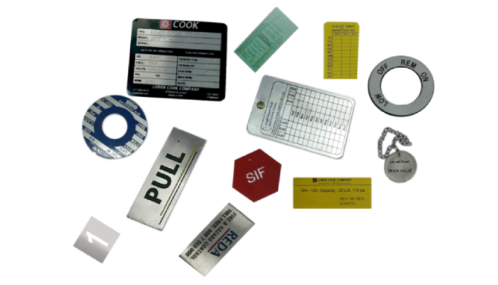 Durable metal tags, office nameplates, and identification badges for businesses.